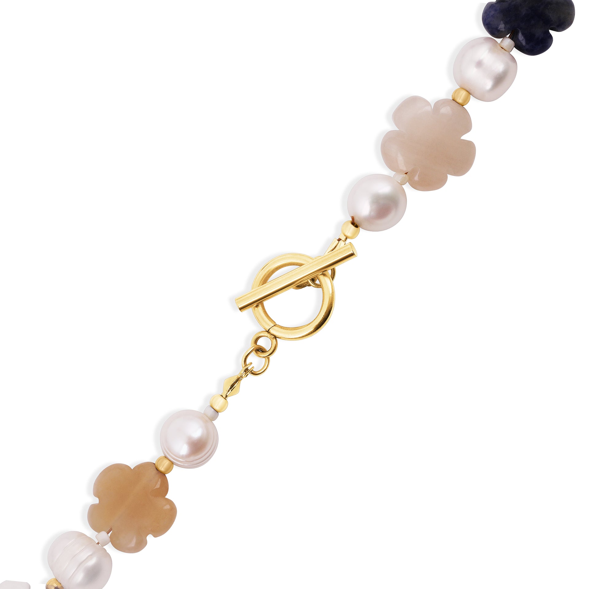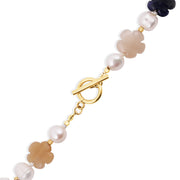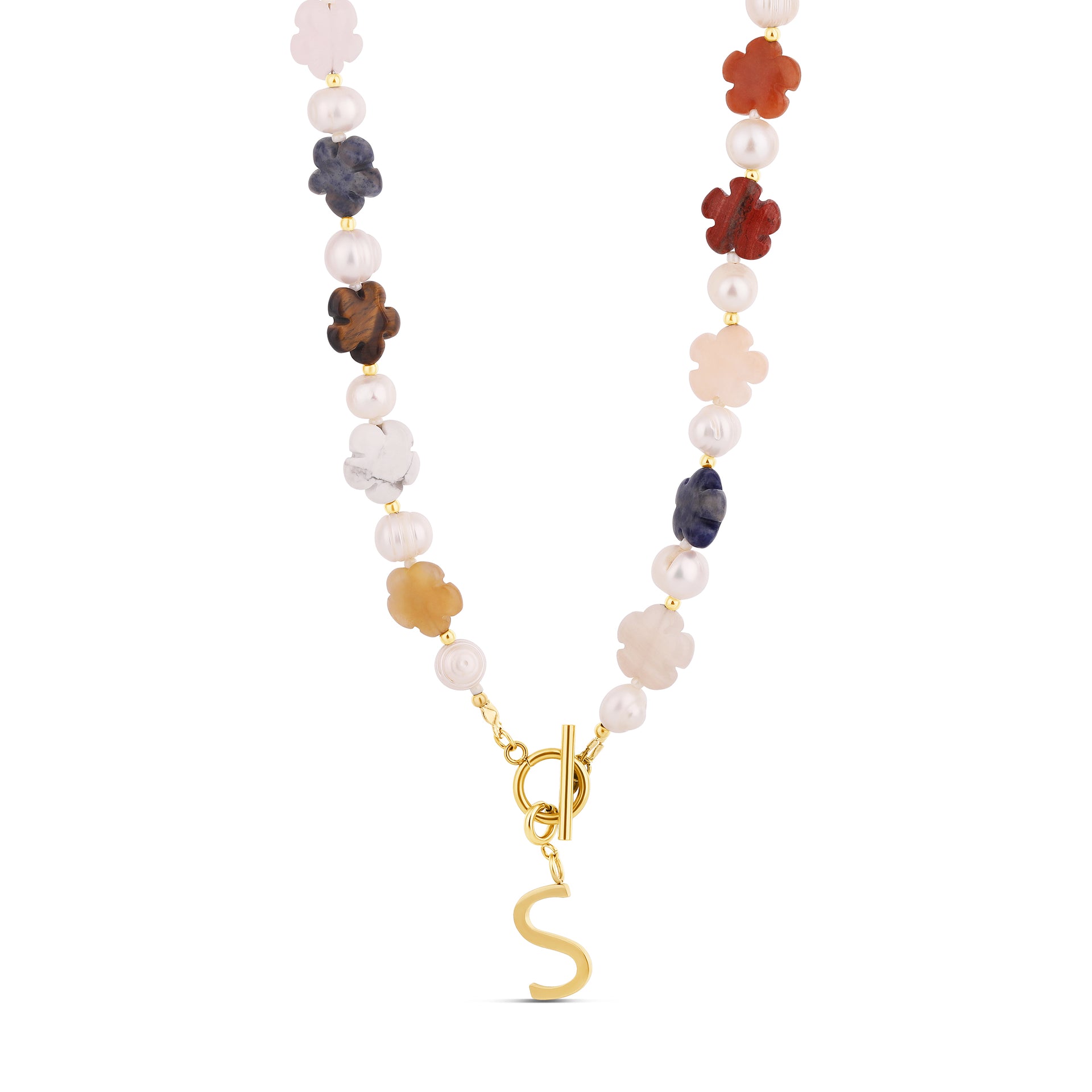 Sweeten your style with the Floral Gemstone & Pearl Necklace from StyledbyA’s Fall/Winter ‘25 collection. This playful piece pairs hand-carved semi-precious gemstone flowers with luminous freshwater pearls and gold accents, finished with a statement toggle clasp. Add a personalized touch with an optional gold letter charm (additional cost)—making it a thoughtful gift or a signature piece just for you.