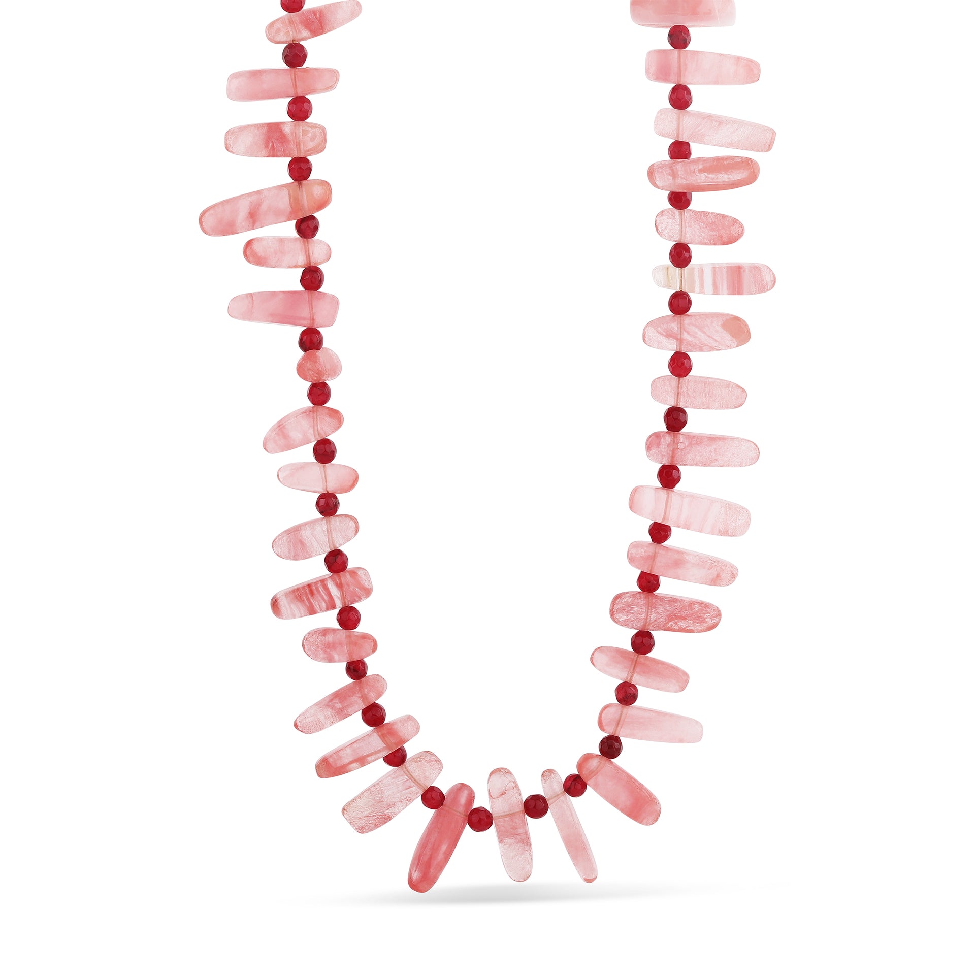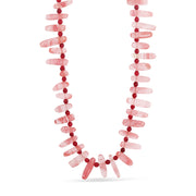 - Semi-precious rose quartz spike beads, accented by deep red stones