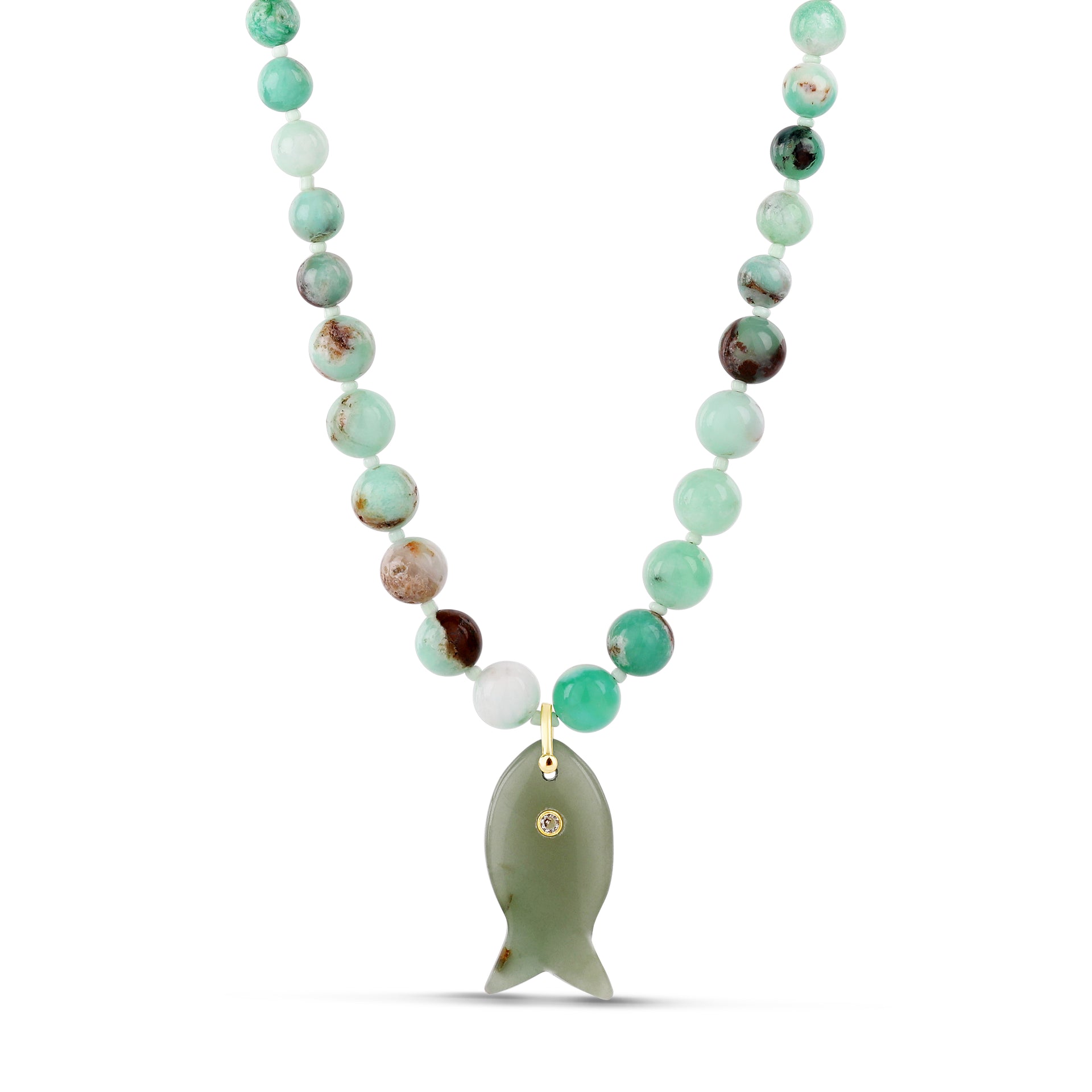 - Features gradient-sized chrysoprase gemstone beads with a carved chrysoprase fish charm