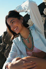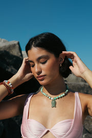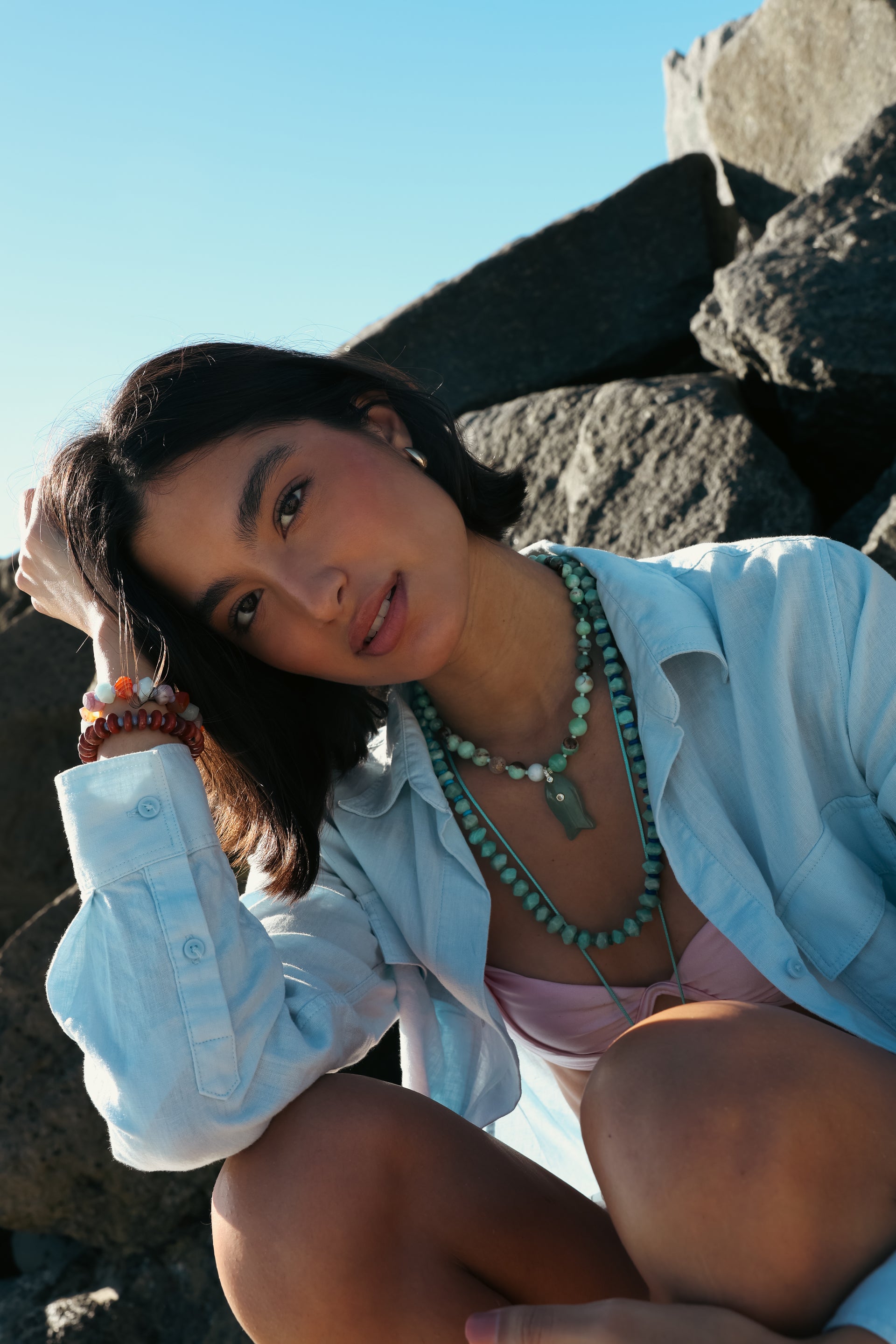 Brighten up your spring and summer with our Green Fish Gemstone Necklace, featuring gradient-sized beads in soothing shades of green and earthy neutrals, finished with a hand-carved chrysoprase fish charm. This playful, coastal-inspired piece brings fresh, beachy vibes and a touch of whimsy to your warm-weather style.